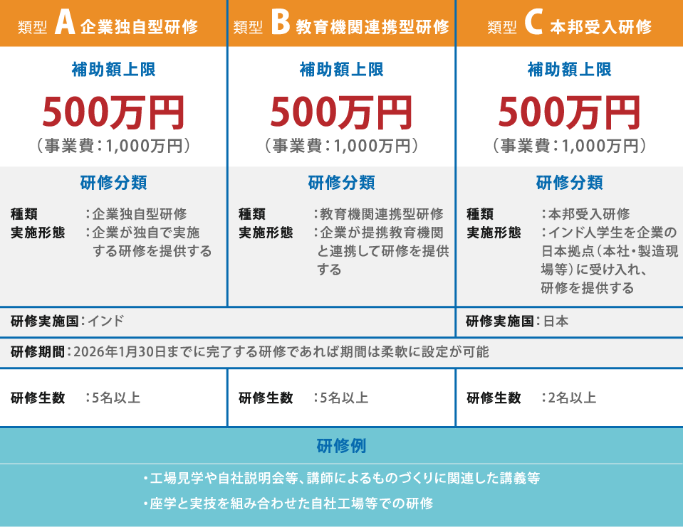 インドにおける人材育成・活用を推進するため、日本式ものづくり学校・寄付講座事業を拡充し、日本企業等による座学やOJTの実践的な教育機会提供等の人材の育成に要する経費の交付を通じて、インド人材の日本企業等への就労及び日本企業等のインド人材雇用の促進を目的としています。