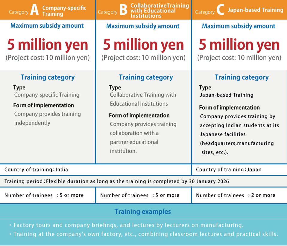 Maximum amount when applying multiple categories: When applying for multiple categories, the maximum subsidy amount is JPY 15 million per company for simultaneous applications across three categories. However, depending on the number of applications received from other companies, one or two types of training may be requested.